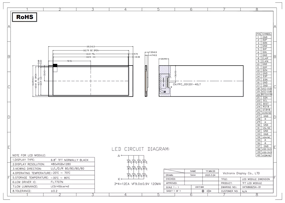 TFT LCD е еден вид на течен кристален дисплеј кој користи технологија на транзистор со тенки филмови за подобрување на квалитетот на сликата и има бројни апликации во секојдневниот живот. Како професионален производител на модули TFT и снабдувач во Кина, што го прави модулот Victronix 6,86 инчи 480 × 1280 IPS TFT различен од другите производители? На почетокот, нуди типична осветленост од 450CD/m², 16,7M бои, широк агол на гледање од 80 ° (типично) во сите правци и сооднос на контраст од 800: 1, обезбедувајќи одлична читливост од различни агли. Второ, таа интегрира единица за задно осветлување користејќи 3 × 4 бели LED диоди со типичен живот од 30.000 до 50,000 часа (до 50% почетна осветленост), обезбедувајќи јасна видливост во сите услови на осветлување. Покрај тоа, тој користи 4-лента MIPI DSI интерфејс за брз трансфер на податоци и поедноставена интеграција. Покрај тоа, поминува ригорозно тестирање на животната средина, вклучително и високо/ниско/ниско ниво на работа и работа, температурно велосипедизам, влажна топлина (влажност) тестирање, така што може да работи беспрекорно преку проширен температурен опсег од -20 ° C до +70 ° C.